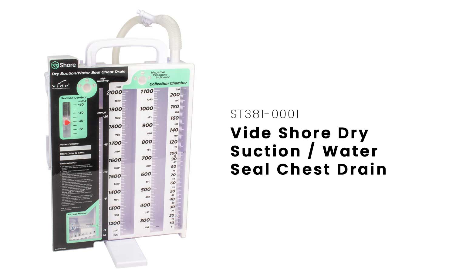 Vide’s Dry Suction Water Seal Chest Drain is a 2000ml sterile disposable three- chamber system that offers the reliability of a traditional water seal drain and the conevenience of a water-less suction control operation.