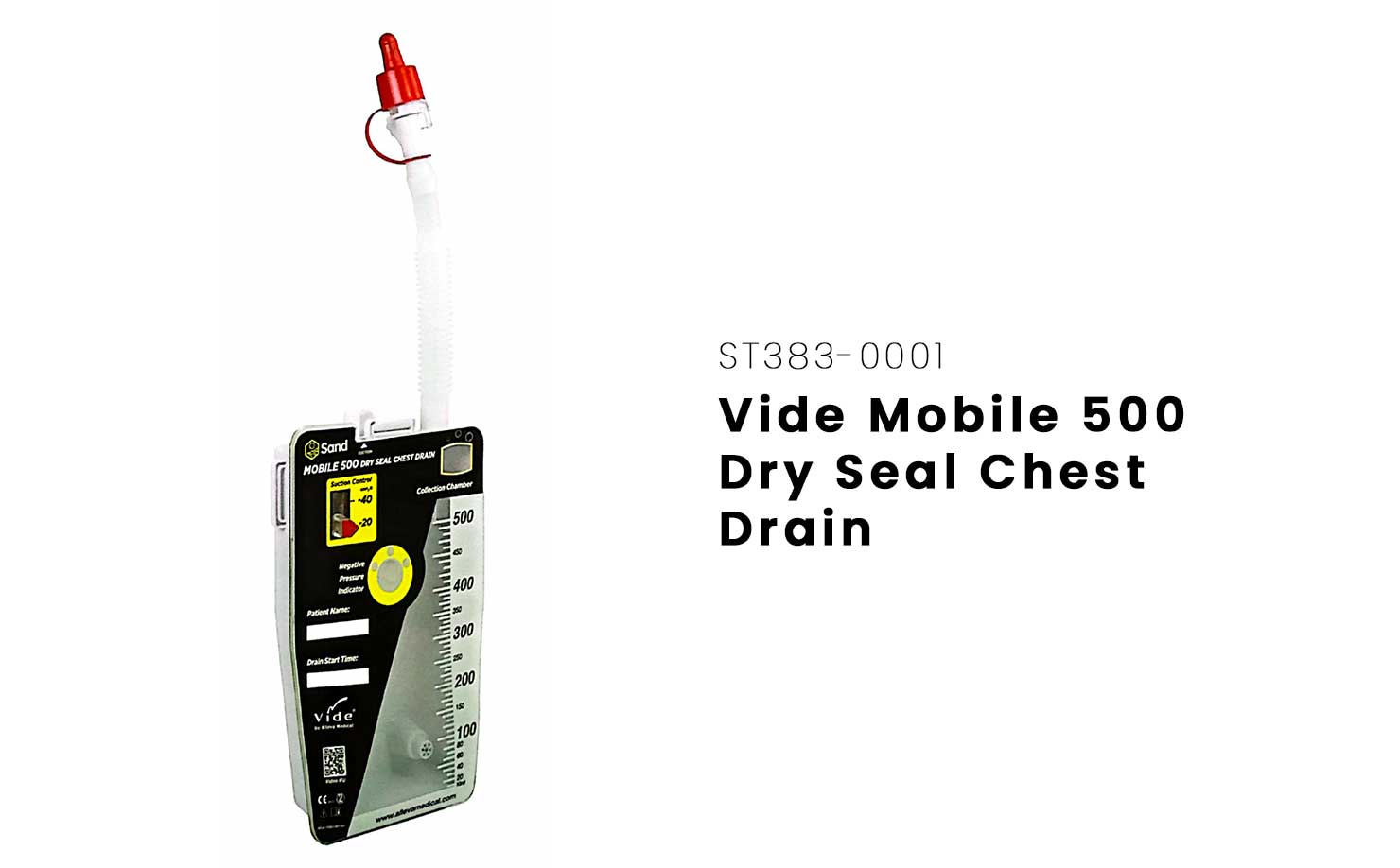 The Vide Mobile 500 Dry Seal Chest Drain is the world’s first full-featured, wearable chest drain that provides greater utility to help patients become ambulatory faster and safer, with the convenience of a 500 mL self-contained collection capacity. The Vide Mobile 500 operates waterlessly, featuring a compact 500 mL collection chamber and an advanced pre-set suction regulator