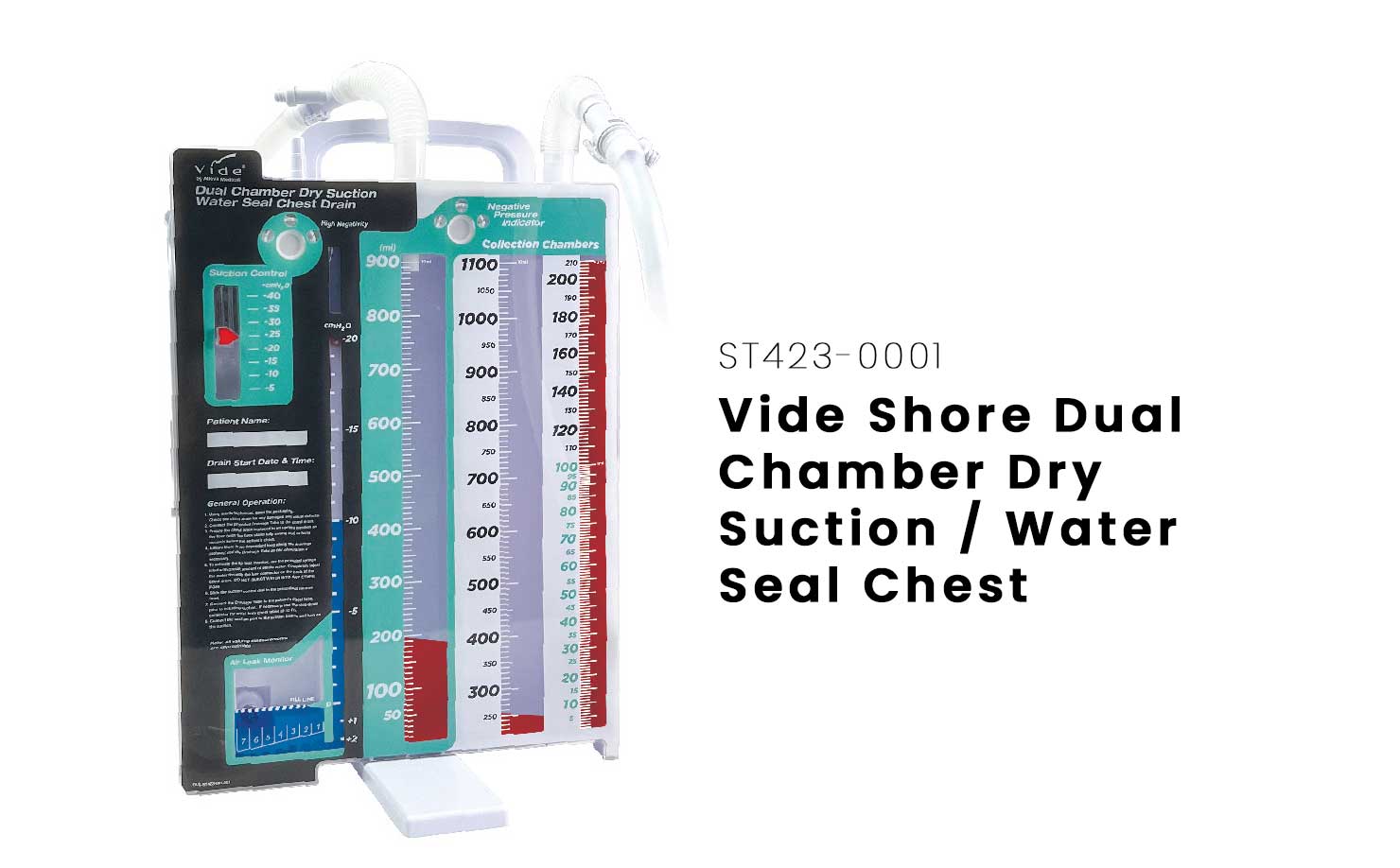 Vide®’s Dual Chamber Dry Suction Water Seal Chest Drain is a 2000ml sterile disposable three-chamber system that offers the reliability of a traditional water seal drain and the convenience of a water-less suction control operation.