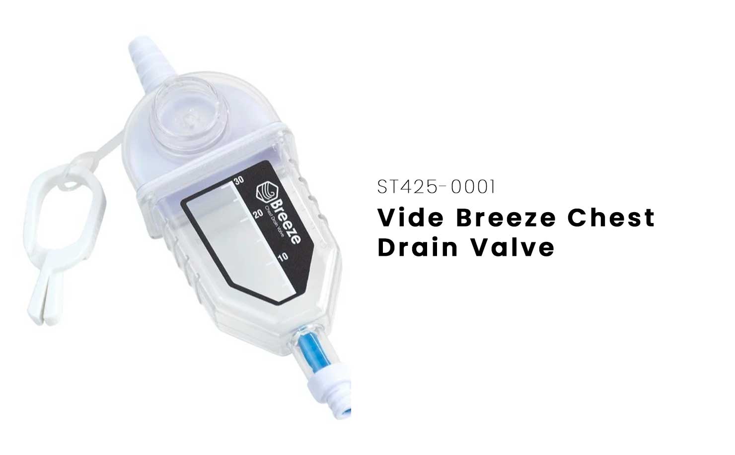 Designed specifically for ambulation and mobility in mind, the Vide Breeze is a disposable chest drain valve with 30ml collection capacity. Works exclusively as a gravity unit, it features the same dry-valve technology found in the Sand chest drains. With transition tubing sets that come with each package, the Breeze chest valve can be connected to small-bore and/or pigtail catheters.